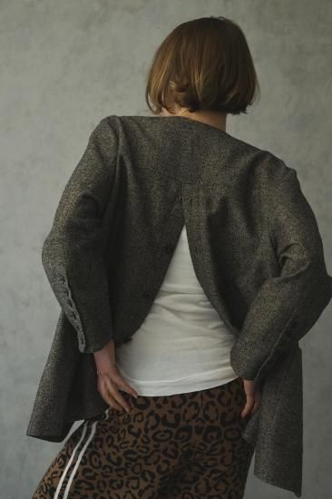 パリッとした程よい厚みの素材感でスッキリとしたゆとりシルエットのメンズライクな雰囲気でありつつ、テーラー風の切り込みノーカラーと細部のボタンデザインが女性らしい個性のあるジャケットに仕上がっています。